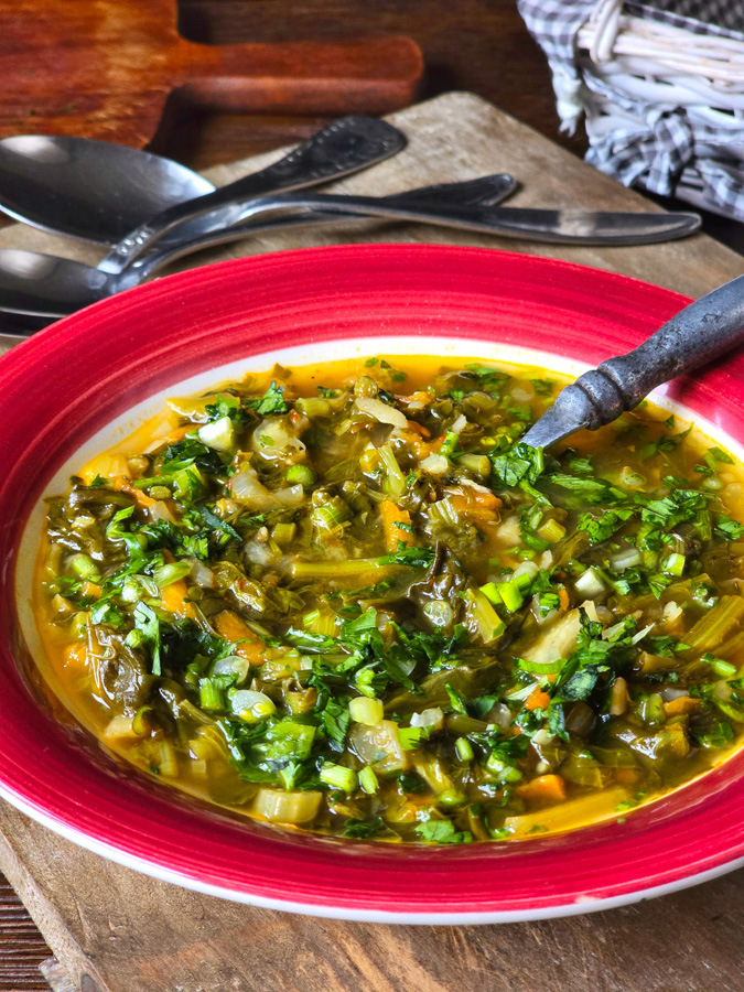 - foarte importantă e partea cu fiertul acestor frunze. gătirea lor corectă, în opinia mea, e undeva între opărire și primul clocot mic. gândește-te că ai aici plante pe care, în mod normal, le poți mânca într-o salată. să le fierbi mai mult de 1-2 minute, pentru mine înseamnă să le distrugi. chiar și 1-2 minute e mult, pentru că timpii ăștia ar fi buni dacă fierberea ar începe din momentul în care torni frunzele în oală. ceea ce e imposibil. pui un kil de frunze peste 3 litri de lichid fierbinte. inevitabil, fierberea se va opri. până o ia din loc cu bolboroseala, deja frunzele alea sunt aproape gătite. după mine, poți să oprești focul și înainte ca ciorba să fi început să fiarbă. dar tu ca să fii sigur, dă-i un clocot. adică până într-un minut, ești foarte bine așa.