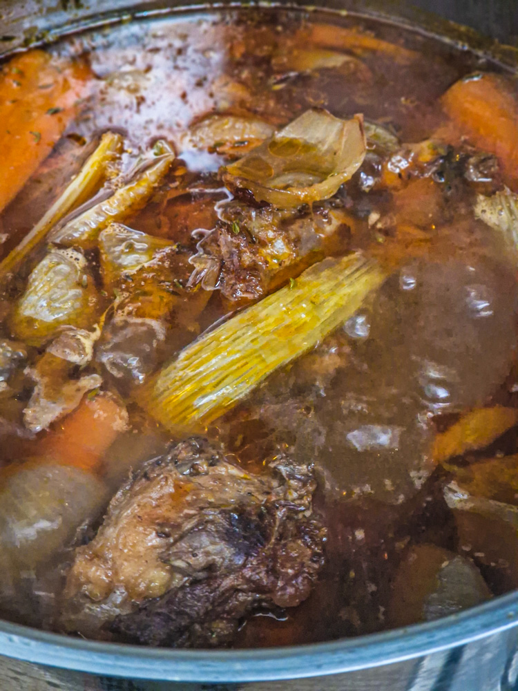 • recomand o oală adâncă de măcar 8 litri. la care eu am folosit 3 kg de oase și carne, 5,5 litri de apă, plus cele câteva legume. iar în final au rezultat aproape 2 litri de supă stock.