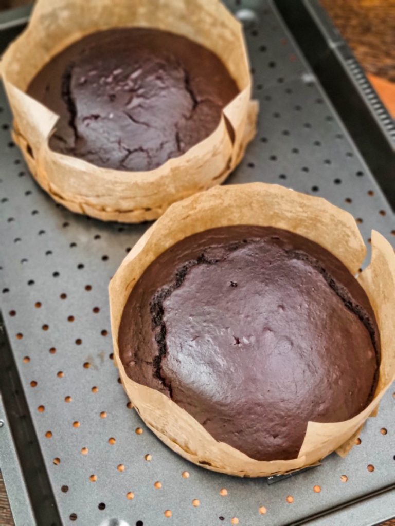 Toarnă aluatul în cantități egale în două tăvi cu diametrul de 18 cm, tapetate cu hârtie de copt – și baza, și pereții -, și coace la 180 de grade. Vor fi gata atunci când înfigi o scobitoare în blat și ea va ieși curată. Estimez, în funcție de cuptor, aproximativ 40 de minute.