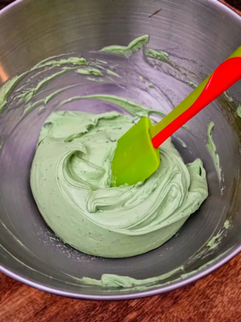Acum e momentul pentru niște culoare, să-i zicem ganache de fistic. Pentru care, din nou, recomand folosirea unui poș și a unui dui stelat pentru forma moțurilor pe care le aplici peste tort. La momentul ornării tortului, scoți ganache-ul de fistic de la rece și îl pui în bolul unui mixer. La început e un amestec dens și vârtos, așa că e indicat să-l mai înmoi puțin. Și o să faci asta cu încă 2 linguri de smântână lichidă pentru frișcă pe care le pui peste el și mixezi cu telul până când se transformă din nou într-o cremă fină și aerată.